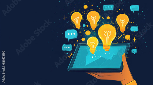 Person Holding Tablet with Glowing Light Bulbs - Representing Innovative Marketing Ideas Against a Blue Background