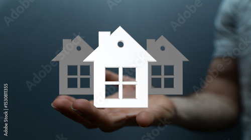 Person holding three house icons, symbolizing real estate, property, home ownership, or investment.