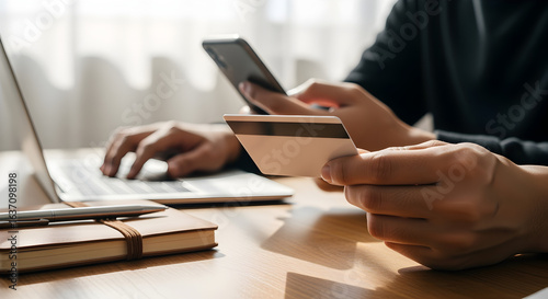 Person Holds Credit Card While Using Phone And Laptop on Wood Desk for Online Shopping Business With Warm Natural