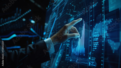 person in a suit is reaching out to touch a digital interface with glowing blue light and data streaming towards them