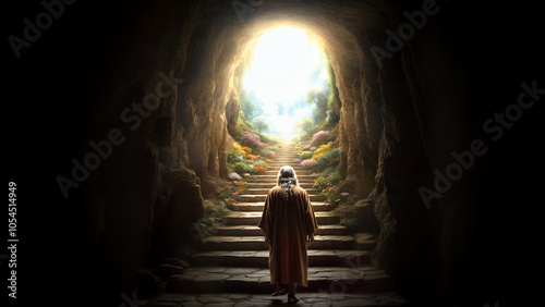 Person in brown robe ascending stone steps through cave tunnel towards bright light at end of tunnel, surrounded by colorful flowers, symbolizing afterlife, near-death experience, inspiration, or hope