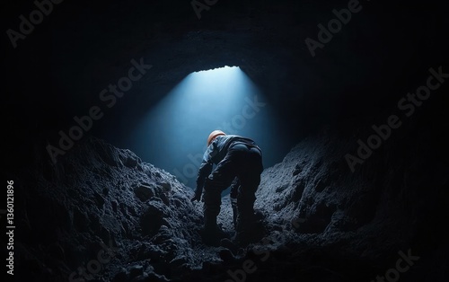 Person in dark gray outfit crouching in a dark cave, illuminated by a single light source from above. Rocks and rough textures are visible