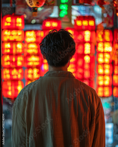 Person in muted shirt, back to camera, faces glowing lanterns.
