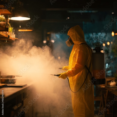 Person in Protective Gear Spraying Disinfectant in Modern Kitchen