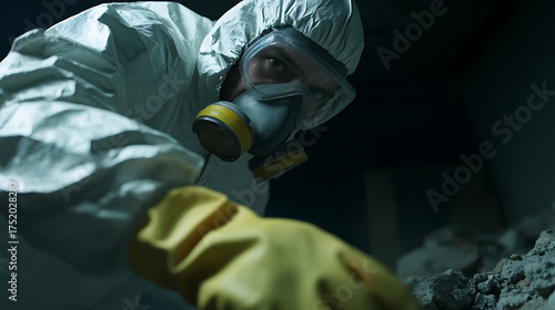 Person in protective suit and gas mask carefully inspecting debris. Hazardous materials expert working in a dark, possibly contaminated area.