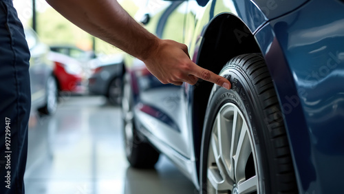Person Inspecting Car Tire Specifications Close-Up
