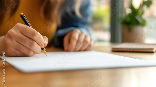 person is signing document with pen, showcasing focus and determination bright, modern workspace