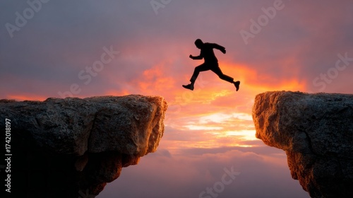 Person jumps across a gap between rocky cliffs during a vibrant sunset with colorful clouds in the background