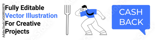 Person leaning forward with hand shading eyes, speech bubble displaying cashback, minimal design. Ideal for finance, rewards, shopping, economy, deals, offers flat landing page banner