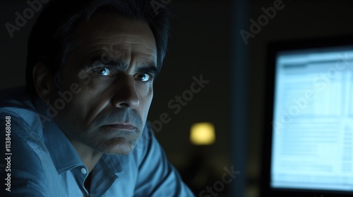 Person looking worried at computer screen, reflecting the pressures and challenges of modern digital life. Navigating complex technology and information overload.