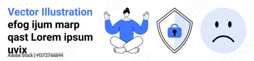 Person meditating in yoga pose, shield with lock symbol, and sad face emoticon. Ideal for mindfulness, cybersecurity, emotional wellbeing, mental health, safety, technology flat landing page banner