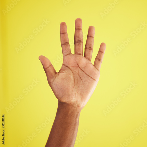 Person, number and raised hand with question for stop or sign in studio on a yellow background. Closeup, fingers and open palm with emoji, symbol or wave for gesture, language or mathematics on space