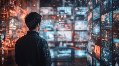 Person Observing Chaotic News Feed on Multiple Split Screens