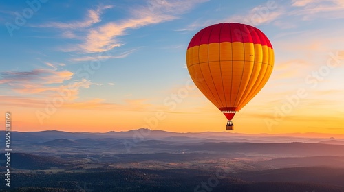 Person on a sunrise hot air balloon ride over a scenic landscape, serene