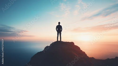 Person on Cliff at Sunset, Solitude and Sunset Over Water