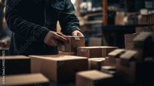 Person packing item with return label, boxes around, symbolizing e-commerce returns.