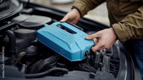 Person performing maintenance on a car engine, using a blue tool kit, with a blurred urban background
