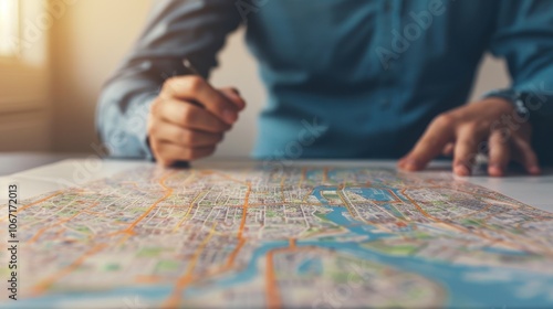 Person Planning Route on City Map Using a Pen in a Warmly Lit Environment