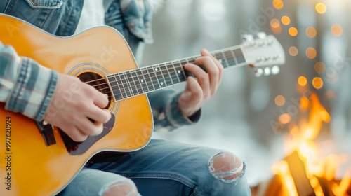 Person playing guitar by a cozy campfire in a serene outdoor setting.