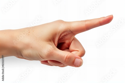 Person pointing finger at object on white background