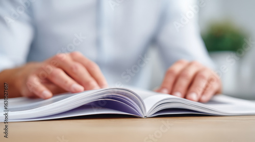Person reading open book at desk hands turning page closeup learning education study focus knowledge calm atmosphere
