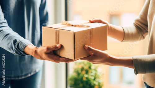 Person receiving parcel from delivery man. Internet shopping concept. Generative IA