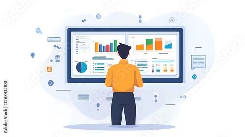 Person reviewing data analytics on a large computer screen displaying charts and graphs.