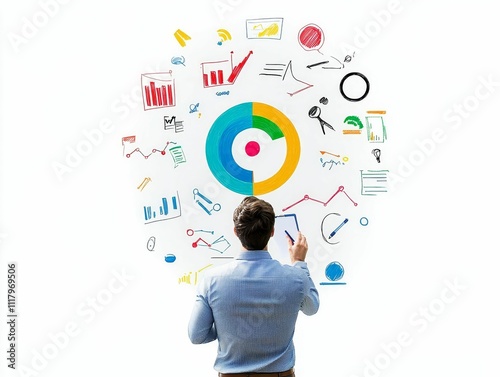 Person reviews colorful data charts, graphs, and diagrams.