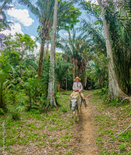 Person riding horse through lush, green forest with tall palm trees in Casanare, Colombia