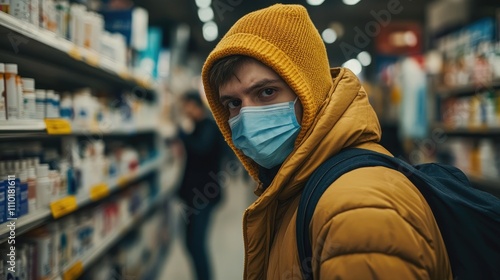 Person shopping for pharmaceuticals in modern drugstore wearing protective mask and yellow hoodie during health safety measures.