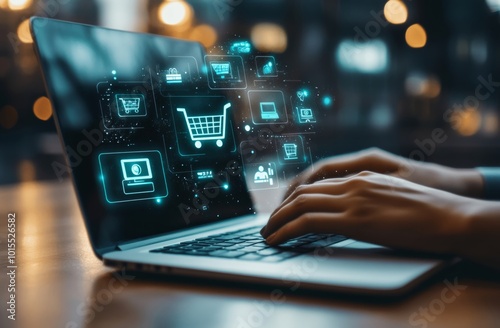 person shops online on their laptop, with shopping icons floating above, focusing on the keyboard.