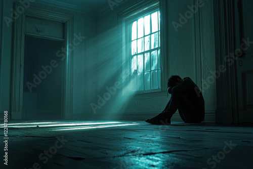 Person sitting alone in a desolate room, bathed in soft light filtering through a window.