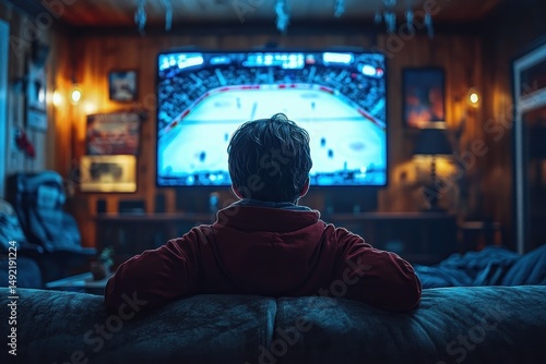 Person sitting on a couch in a cozy wooden room watching an ice hockey game on a large TV screen, relaxed evening atmosphere