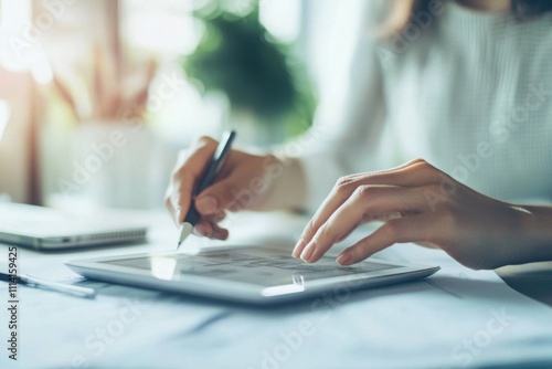 Person sketching on a digital tablet using a stylus, with natural light and blurred background creating a creative workspace