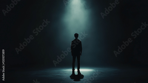 person standing alone in dark room with divine light concept of mental disorder due to stress and anxiety loneliness