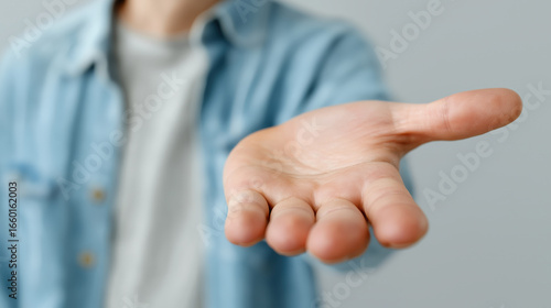 Person standing and gently extending one hand forward, wearing casual blue shirt and white t shirt, with soft and inviting gesture, neutral background