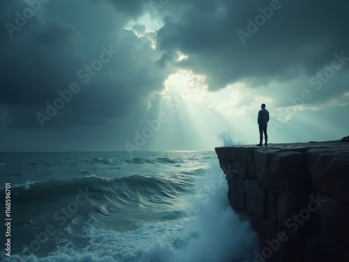 Person standing at the edge of a rocky shore gazing at the ocean and dramatic clouds while waves crash against the rocks during twilight