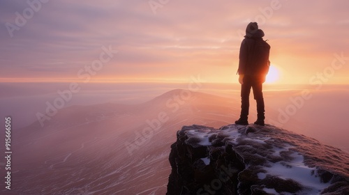 Person Standing on Mountain Peak at Sunrise in Winter Landscape