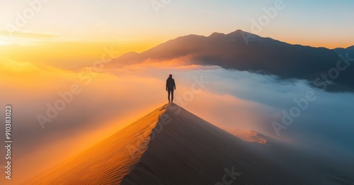 person standing on top of the sand dune, with mountains and fog in the background, at sunrise