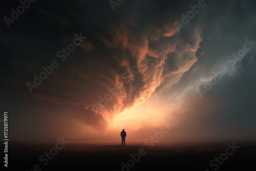 Person standing silhouetted against a vast landscape with dramatic storm clouds and a bright distant light