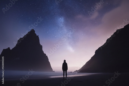 Person stands on a beach at night watching glowing waves and a starry sky above coastal cliffs