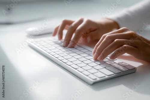 Person types on keyboard in office. Clean, modern, workspace, technology concept. For website, marketing, editorial, design.