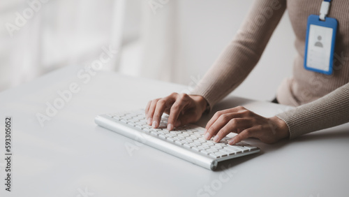 Person typing on a computer keyboard, businessman is working in a startup company's office, he is typing messages to his colleagues and making financial documents summarizing the meetings. Copy space.