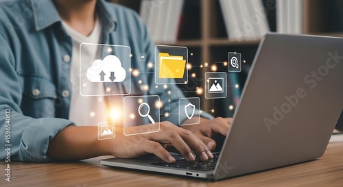 Person typing on a laptop with digital technology icons floating above