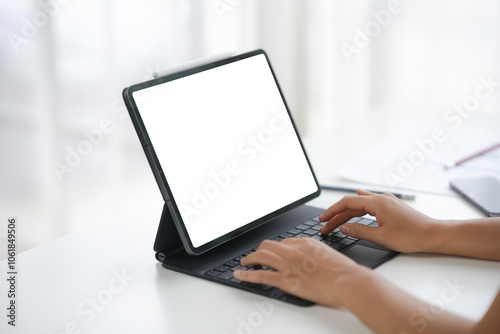 Person typing on a tablet with a keyboard attachment, modern technology setup for work or online activities in a well-lit environment.