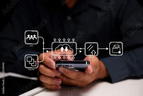 Person using a smartphone with digital icons illustrating cloud upload, data set, user, and printing processes.