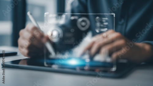 Person using a tablet and stylus with a futuristic holographic display overlay.