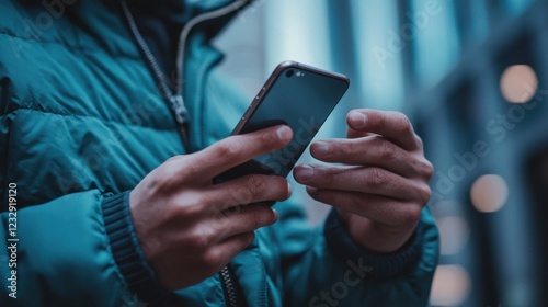 Person Using Smartphone in Urban Environment During Evening Hours