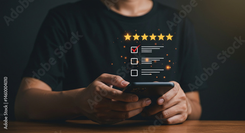Person using smartphone with customer review stars and checklist overlay in a dark setting business, data