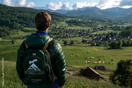 Person viewing a simulated Northern European countryside, with green fields, grazing animals, and gentle hills